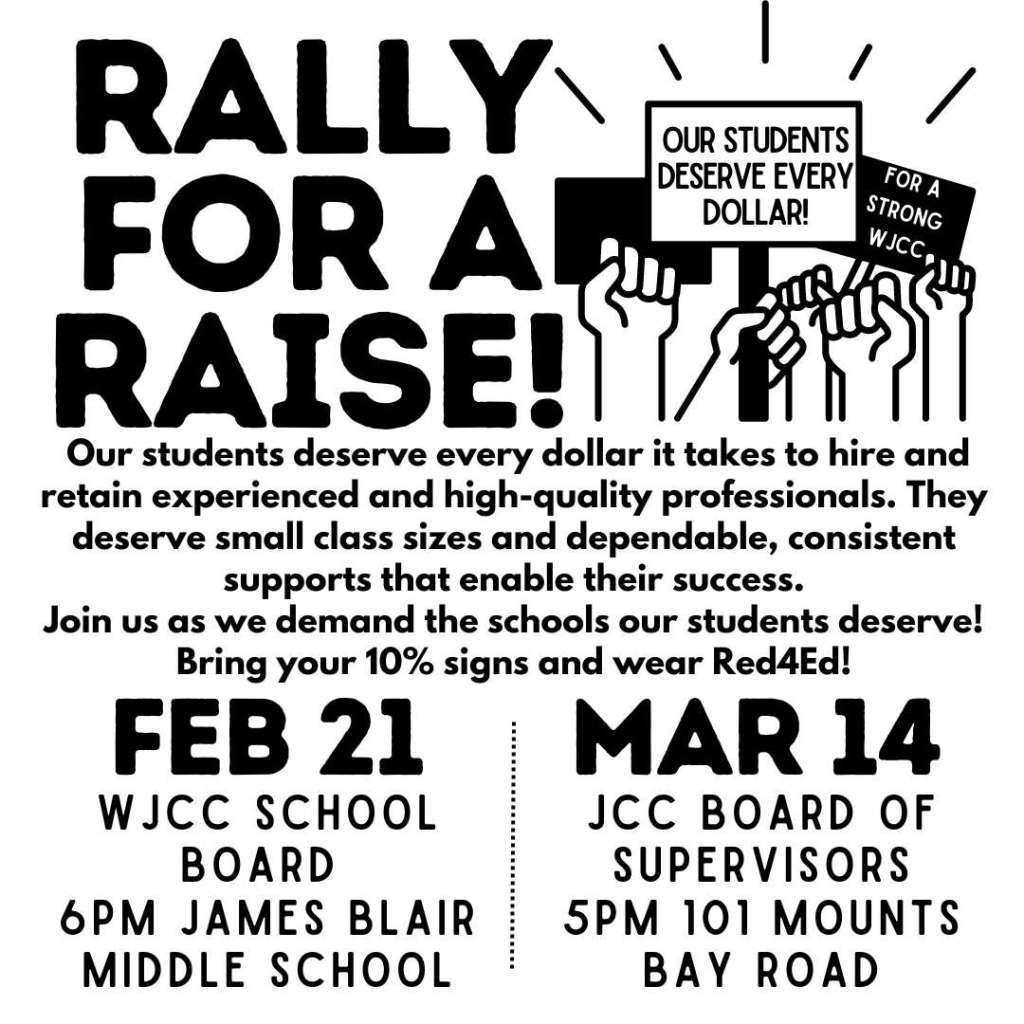 | A 10% raise for all WJCC School employees is still attainable, but it will take teachers, parents, and the community working together.Join us on Tuesday, March 14th at the James City Board of Supervisors Meeting at 101 Mount Bay Road. RSVP Here WJCC Schools has a large shortfall in the 2023-2024 budget and we need the James City County Board of Supervisors to step up to meet the needs of our schools. As of the February Regular School Board meeting, WJCC needs an additional $8.5 million dollars in the FY2024 operating budget to fund a 9.9% increase in employee health insurance costs, an addition of full-time instructional positions to sustain a high-quality education, and a 10% raise to retain and attract our education professionals. The more James City County fails to fund WJCC schools’ shortfall, the more sacrifices to the quality of our students’ education will be needed at a time when WJCC schools are facing unprecedented challenges. We must send a clear message to the James City County Board of Supervisors that our students deserve every dollar! Click here to send an email to the James City County Board of Supervisors! |